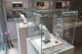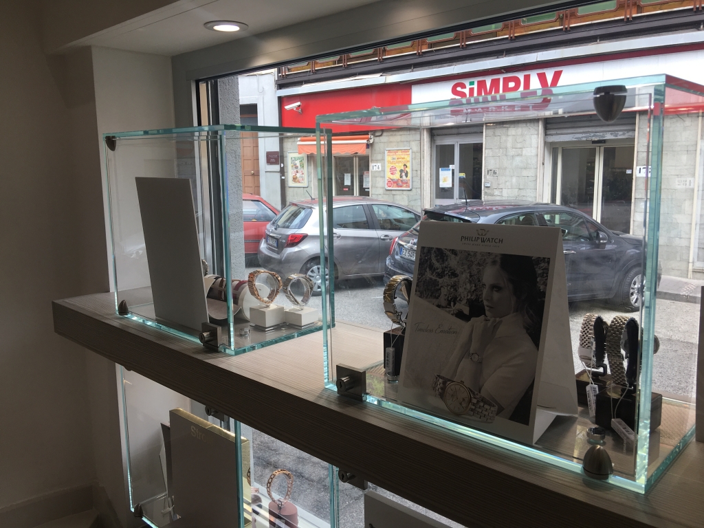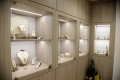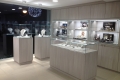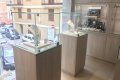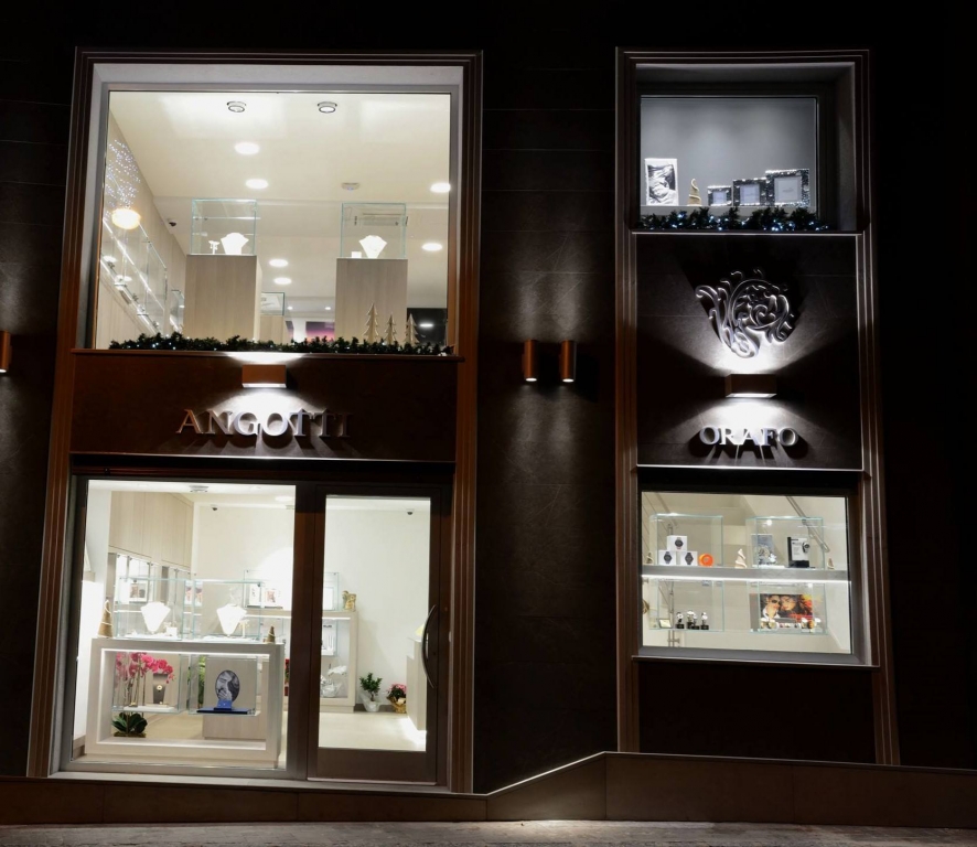 La progettazione di questa attività commerciale puntava ad ottimizzare il poco spazio disponibile. Lo sviluppo su più piani ha permesso un separazione degli ambienti di lavoro e dei prodotti in esposizione. La scala, in quarzo bianco e balaustra in acciaio, aumenta luminosità agli ambienti. L’ impiantistica è stata totalmente rinnovata. Per l’ impianto di riscaldamento, trattamento e purificazione aria sono stati inseriti climatizzatori a soffitto.  Le lavorazioni in cartongesso hanno permesso di nascondere l’ impianto di climatizzazione, creando effetti di luce soffusa. L’ illuminazione a led, tramite spot e strip led ad incasso, ha permesso un’ illuminazione ottimale in base alle diverse aree espositive. Gli arredi, in legno e vetro, sono stati progettati su misura. Le teche, in vetro temperato, fuoriescono dalle nicchie rendendo preziosi gli arredi stessi. L’ esterno si presenta con le grandi aperture allineate ed incorniciate. Una grande fascia marcapiano separa il grande basamento rivestito in lastre di pietra ed il resto del fabbricato. Il tutto conferisce eleganza all’ intero progetto. Le scritte a rilievo sulla facciate sono illuminate da corpi luminosi che creano grandi effetti visivi.